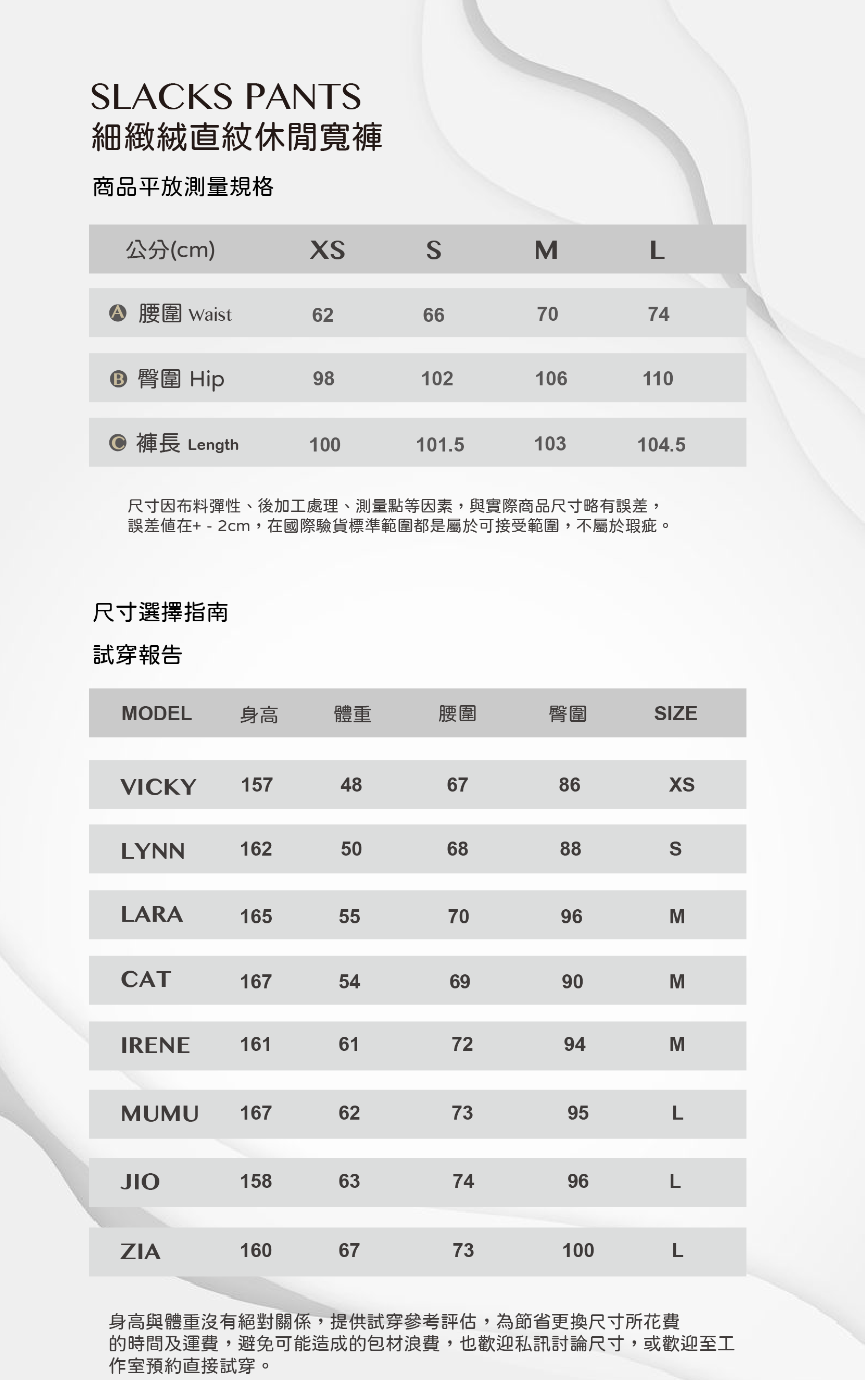尺寸的選擇可依個人喜好的寬鬆程度選擇